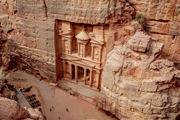 Visitar la emblemática ciudad de 2000 años con el Tesoro de Petra, de 45 m de alto, tallada en la montaña de piedra roja.